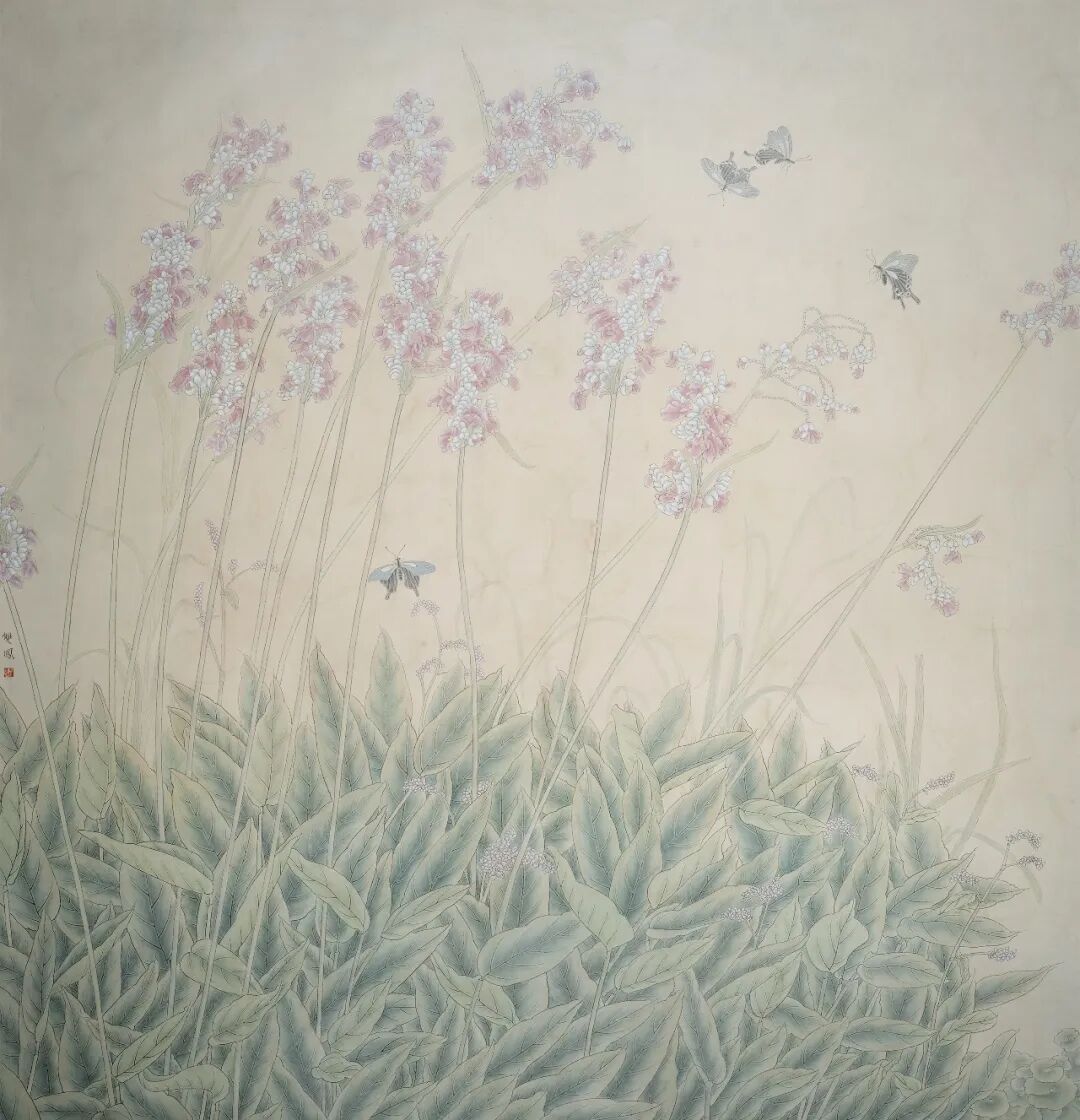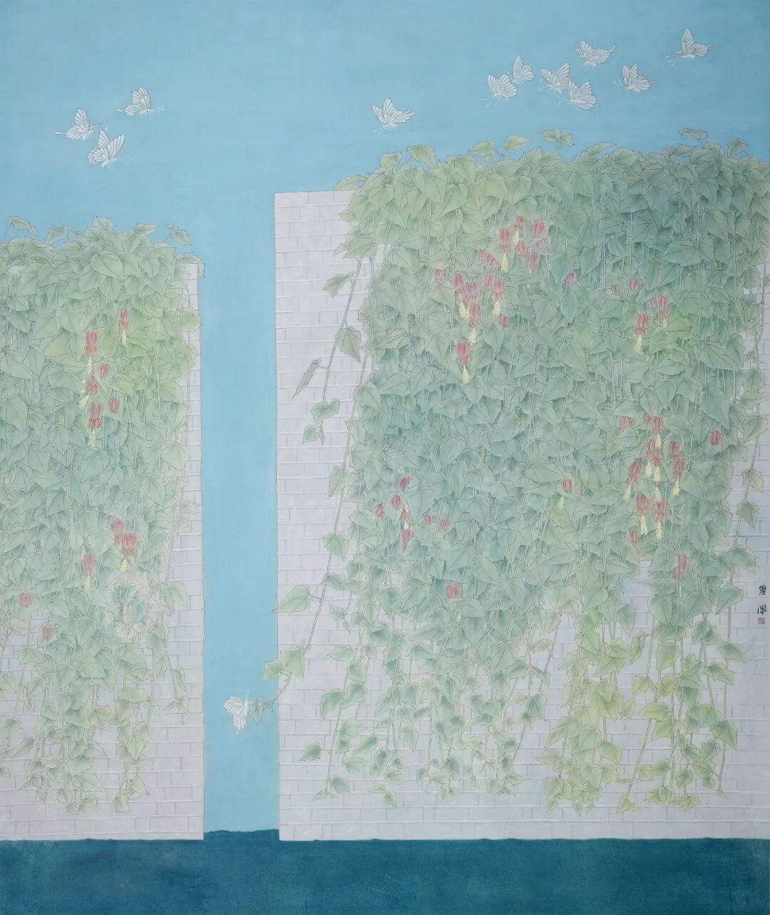 这幅《秋以为期》以蓝绿为主调,藤蔓攀墙而生,叶片层次与花朵细节刻画精工。白蝶群飞于天际,与墙间绿植形成动静对比。构图借建筑与植物的组合,在传统工笔中融入现代空间感,设色清新雅致,于细腻笔触间展现自然生机与静谧意境。