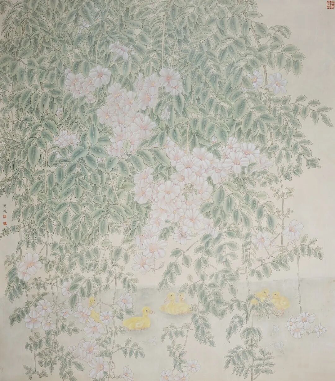 这幅《家园》满溢生机。粉花绿叶层层叠叠,工笔技法将花叶纹理刻画得细腻入微。几只小黄鸭或游或嬉,为画面添灵动意趣。整体设色柔和雅致,构图繁而不乱,于传统工笔的精工细作中,营造出清新自然、充满童趣的春日景致。